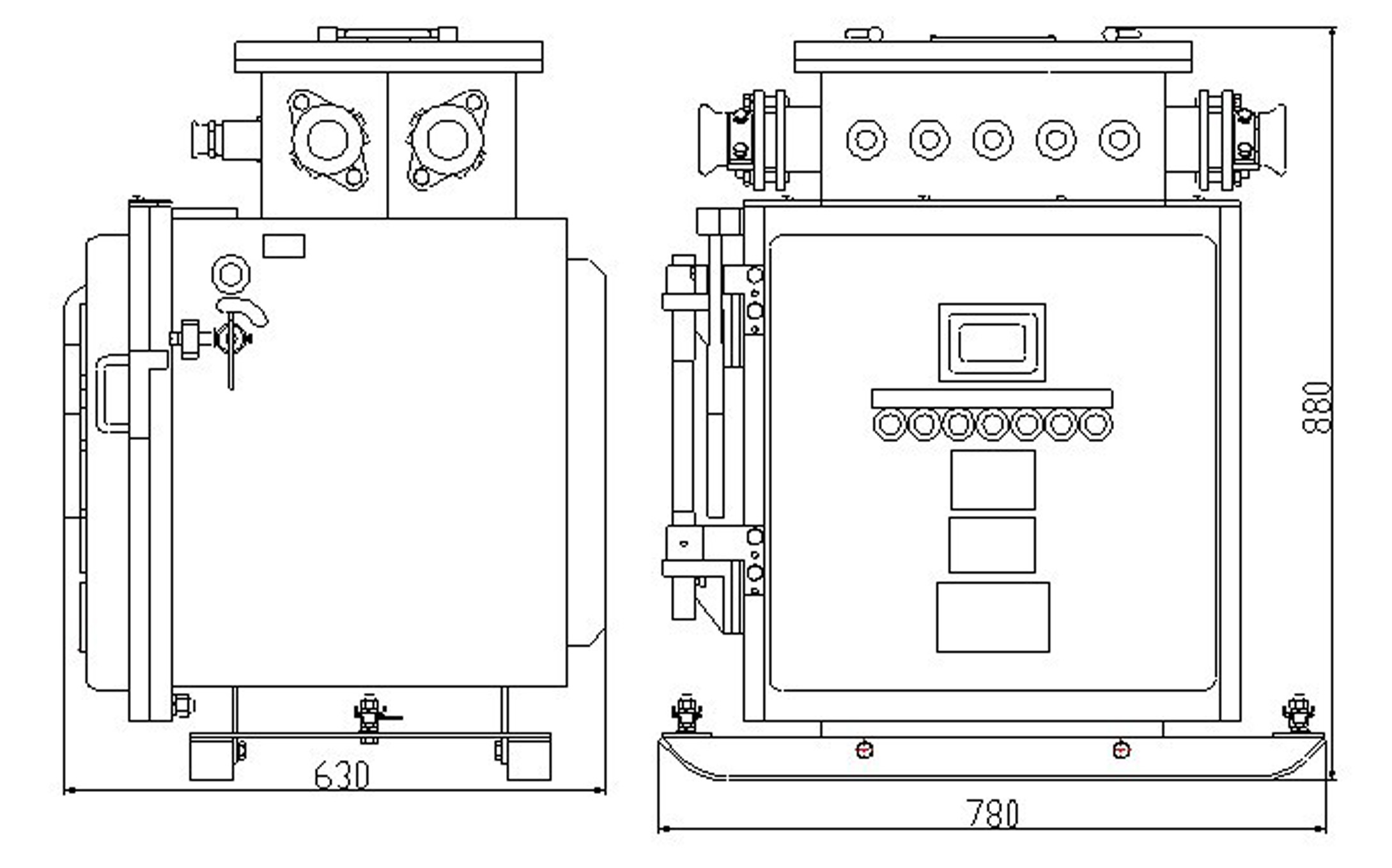 綜合裝置由隔爆外殼、主變壓器和控制部分等組成。隔爆外殼為方形,殼蓋與殼身采用滑動(dòng)止口結(jié)構(gòu),開(kāi)啟方便。外殼上部的接線箱作為引進(jìn)和引出電纜用,外殼右側(cè)裝有操作組合開(kāi)關(guān)的手柄,并有可靠的機(jī)械聯(lián)鎖裝置,門(mén)蓋上裝有控制按鈕和試驗(yàn)按鈕,門(mén)蓋上有一觀察窗,可以從外面觀察到裝置里面液晶漢顯顯示屏的指示狀態(tài)。殼體內(nèi)的控制部分由控制器件板和真空交流接觸器板組成。在控制器件板上裝有微電腦控制器、液晶顯示屏、電流取樣板、電流傳感器、濾波器、電源控制變壓器、試驗(yàn)電阻、保險(xiǎn)等器件。真空交流接觸器板上裝有真空交流接觸器、管式熔斷器,電流互感器,三相電抗器等器件。控制器件板與真空交流接觸器板通過(guò)一組航空插件及連線構(gòu)成聯(lián)系。防爆外殼箱體內(nèi)裝有主變壓器。